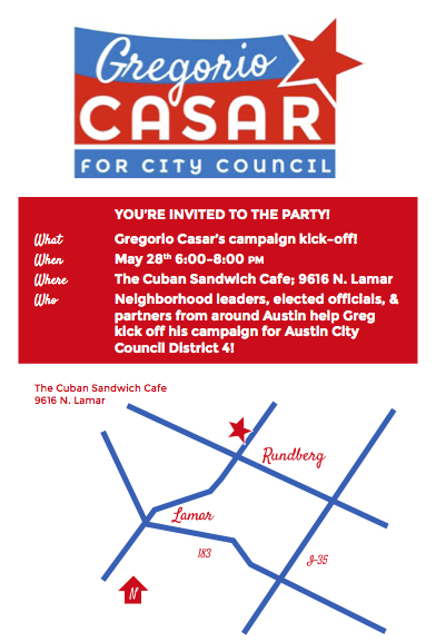 Casar is kicking off his campaign on May 28th at 6:00 at the Cuban Sandwich Cafe (9616 N. Lamar). You can keep track of Casar’s campaign through his facebook page and his campaign website.